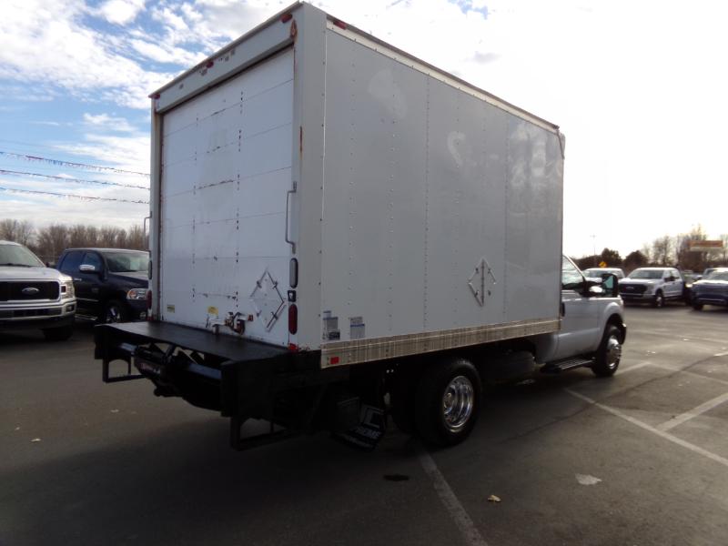 Solid, out of state F350 DRW RWD cube truck with gas 6.2L V8. 14,000 lb. GVWR. 4.10 gears with limited slip. Inside of van is 12' deep, 7.6' wide, & 6.5' tall. XL pkg. with a/c, tilt, cruise, am/fm/stereo, split bench seat, Tommy lift end gate, running boards, roll-up door, up-fitter switches, mud flaps, clearance lights, and more. Professionally detailed, good tires, runs and drives great with 109,889 miles.